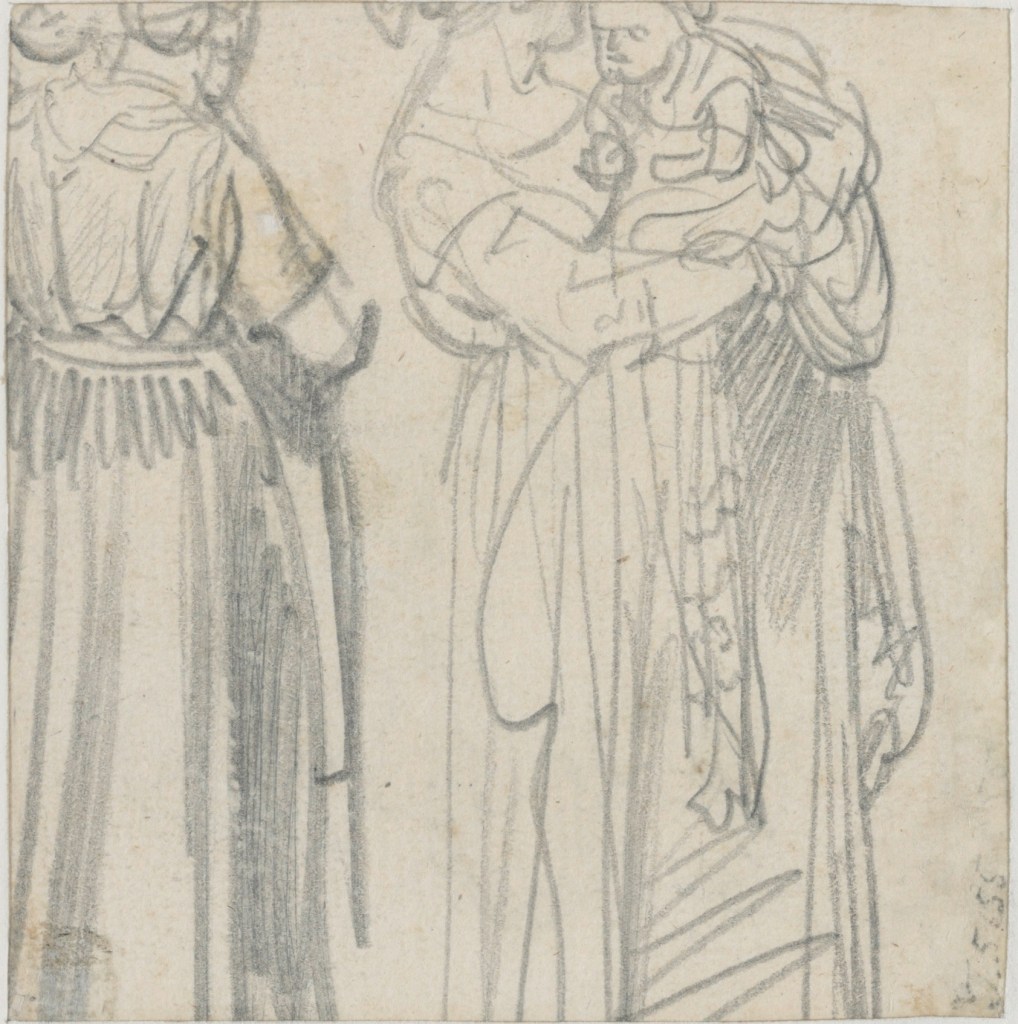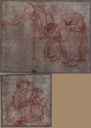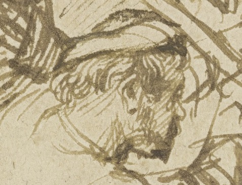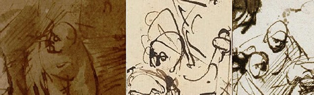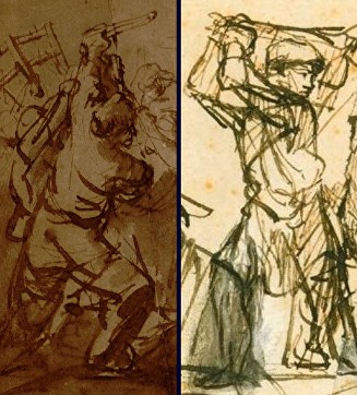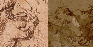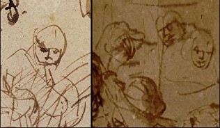 Fig.a. Detail of Benesch 519 (left) with a detail of Benesch 332 (right), both enlarged: the fine underdrawing in the former resembles the latter