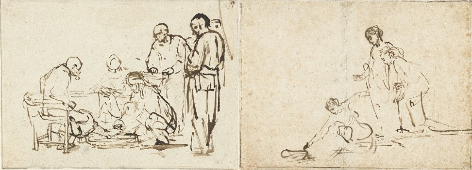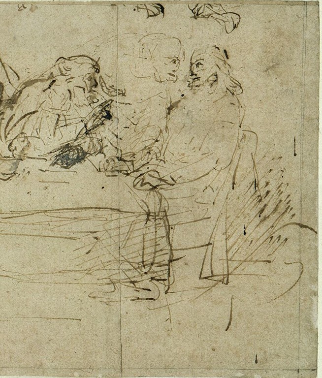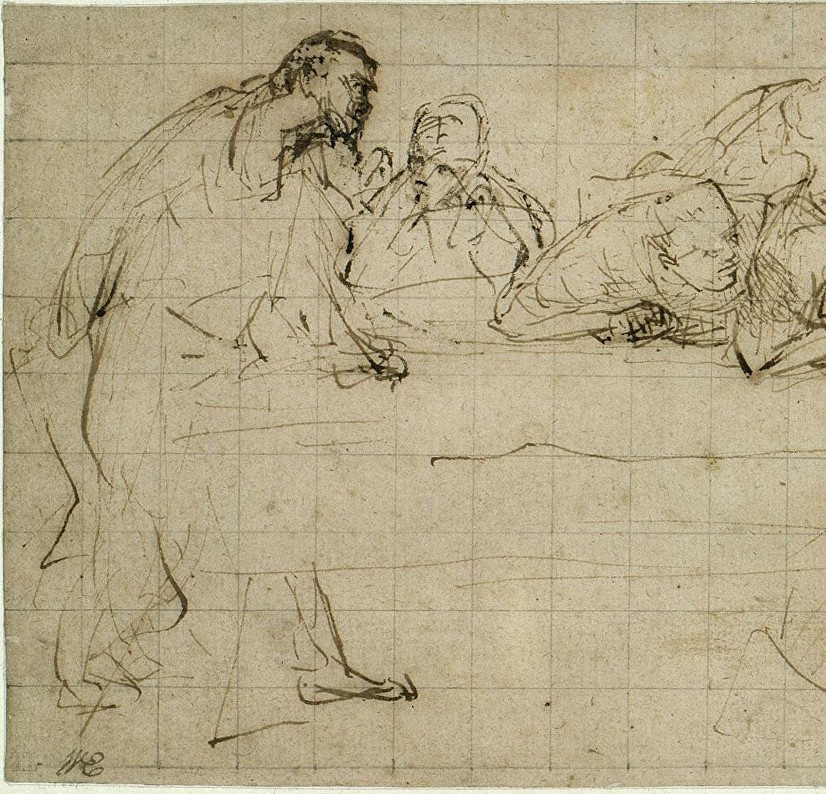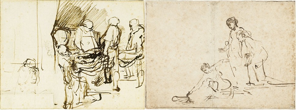 Fig.e. Rembrandt (Benesch 482), The Entombment, c.1640. Pen and brown ink, 156 x 201. NL Amsterdam, Rijksmuseum (inv. RP-T-1930-28) Compared with Benesch 475 on the right.