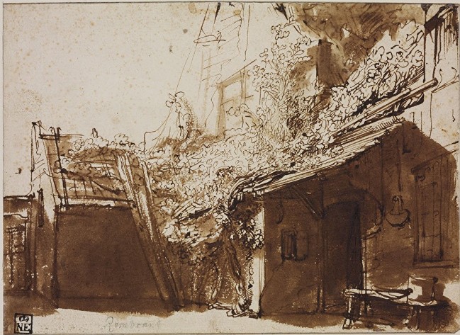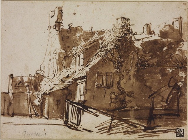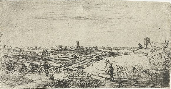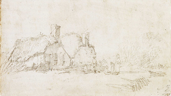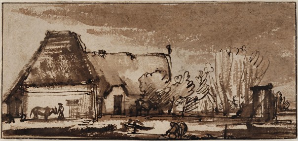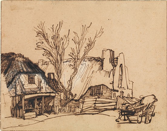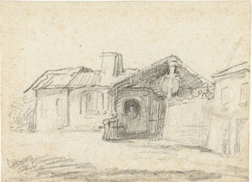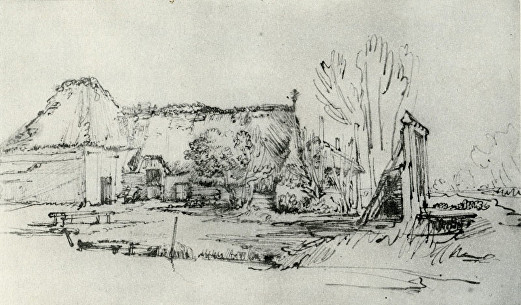 Fig.a. Rembrandt, Cottages and Farm Buildings with a Man Sketching, c.1643-47. Etching, 130 x 208, Bartsch 219; NH 201, only state. NL Amsterdam, Rijksmuseum (RP-P-OB-278) NB Illustrated in Reverse