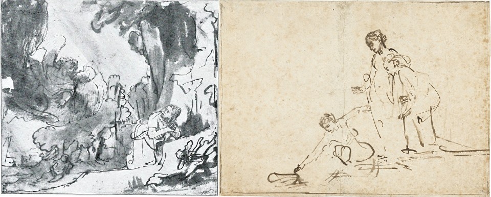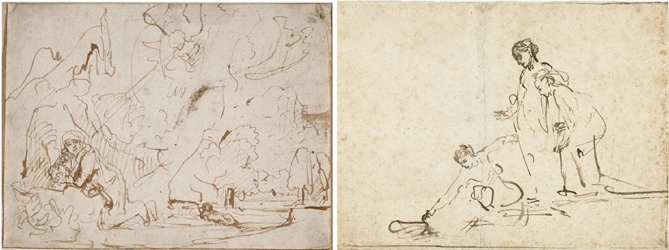 Fig.c. Left: Ferdinand Bol, The Angel Appearing to Hagar and Ishmael in the Desert, c.1645-50? Pen and brown ink touched with brown wash. R Moscow, Pushkin Museum (inv.4516; Sumowski 242x) Compared with Benesch 475 on the right.
