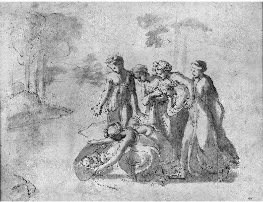 Fig.j. Giovanni Francesco Penni, The Finding of Moses (after Raphael), c.1517-19. Pen brown ink and brown wash, squared in black chalk, 220 x 289. GB London, Victoria and Albert Museum (inv. Dyce.185)