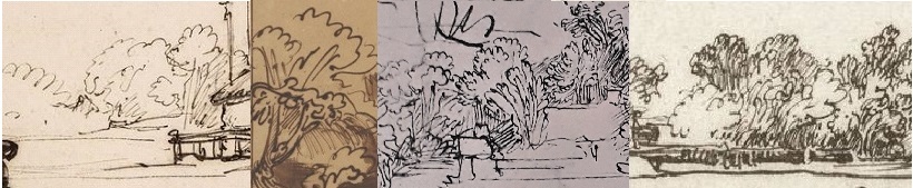 Fig.a. Comparisons for the looping foliage with other drawings by Rembrandt, left to right, details from Benesch 801 (Dresden), Benesch 469 (Weimar), Benesch 472A and Benesch 799 (Dresden)