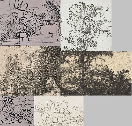 Fig. b. Comparisons for the looped lines in the foliage and, in the case of 2, with the hatching. Details from Rembrandt’s etchings (2, 3, 4 and 6 from Rijksmuseum, Amsterdam) all illustrated reversed, thus as they were on Rembrandt’s etching plate as he drew them: