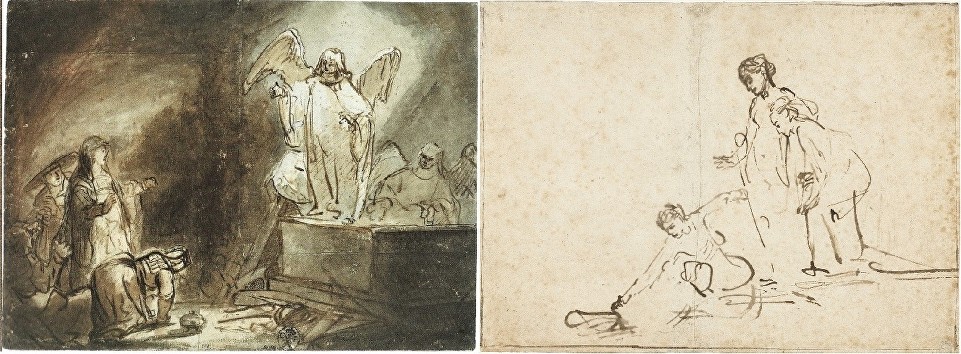 Fig.b. Left: Ferdinand Bol, The Three Maries at the Tomb, c.1644. Pen and brown ink with brown and grey wash, and red chalk over traces of black chalk, the figures drawn on separate pieces of paper pasted in, 233 x 317. D Munich, Staatliche Graphische Sammlung (inv. 1842), Compared with Benesch 475 on the right.
