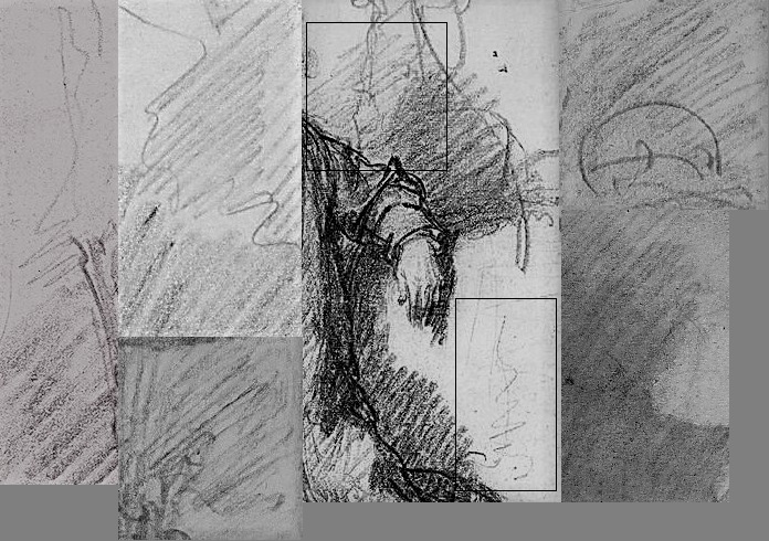 Fig.e. Mosaic illustration: left to right, details from Benesch 6 verso (e.6), Benesch 428 (e.1) with Benesch 46 below (e.4), Benesch 82 (e.2, marking out those areas which are particularly to be compared in the adjacent photographs: the shading and the trailing lines), another detail from Benesch 46 (e.3) and Benesch 90 (e.5)