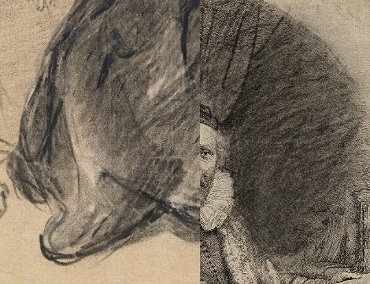 Fig.a. Illustration with Benesch 467 combined with a detail (outlined) of Benesch 819 from the same collection inserted to the right of centre. This comparison does not suggest that the two drawings are by different hands. Both NL Amsterdam, Rijksmuseum