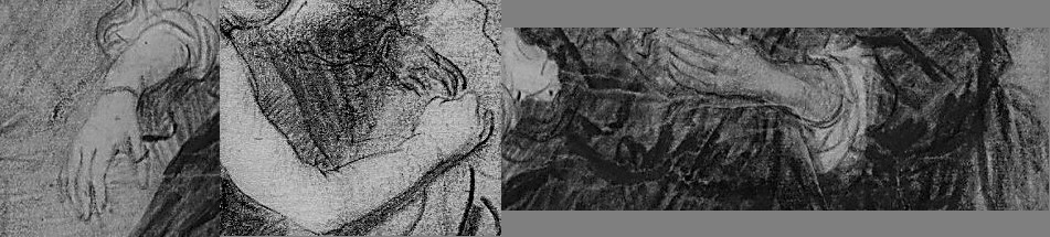 Figs k.1-3 Mosaic of three details, showing comparable dark accents in and near the sleeves, from Benesch 428 top left, Benesch 40 below left and Benesch 37 right. The contrasts are stronger in Benesch 0428 as the other two drawings are in red, rather than black chalk