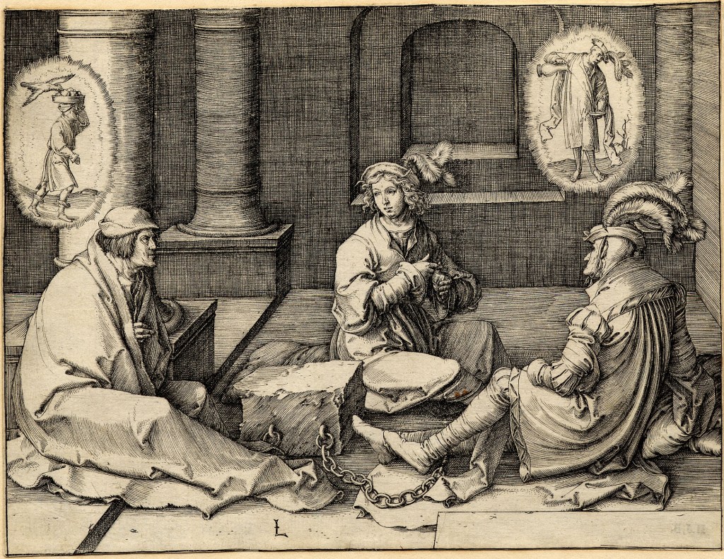 Fig.b. Lucas van Leyden, Joseph Interpreting the Dreams of the Butler and Baker, 1512. Engraving, 127 x 165. Bartsch/New Hollstein 22. GB London, British Museum (inv. 1849,1027.13)